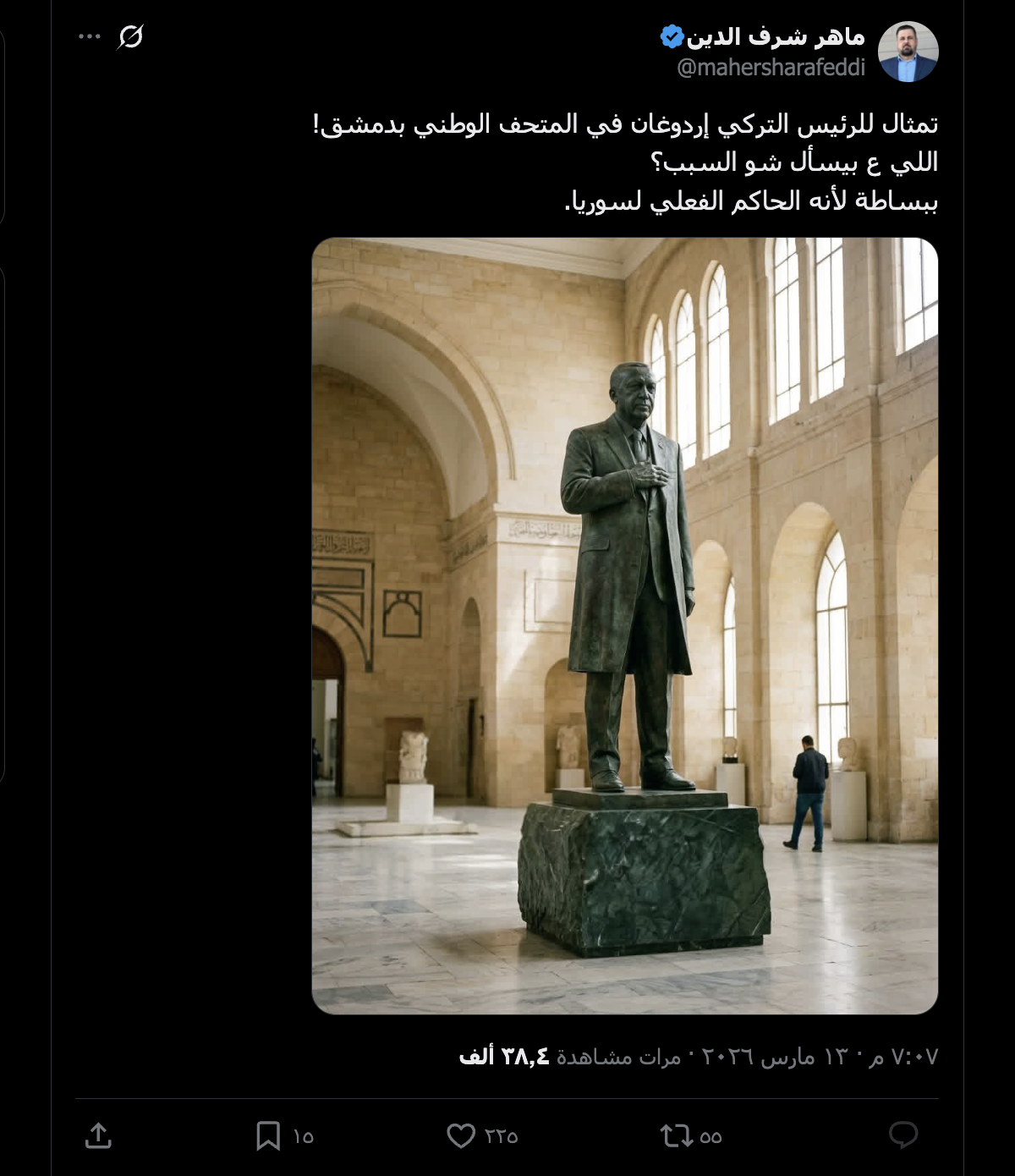 انتشرت على مواقع التواصل الاجتماعي صورة يزعم ناشروها أنها لتمثال للرئيس التركي رجب طيب إردوغان وُضع في المتحف الوطني بدمشق، وأُرفقت بتعليقات سياسية تدعي أنه “الحاكم الفعلي لسوريا”.