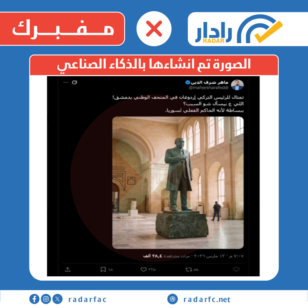 تحقق فريق منصة "رادار" من الصورة المتداولة عبر البحث العكسي، وتبين أن مصدرها صفحة ساخرة على فيسبوك تحمل اسم "دخلك بتخرف؟"، وهي صفحة معروفة بنشر محتوى فكاهي وغير حقيقي. كما أظهر التحليل الرقمي عبر أداة (SynthID) أن الصورة تم إنشاؤها أو تعديلها باستخدام أدوات الذكاء الاصطناعي من Google، حيث تفتقر الصورة للواقعية البصرية عند التدقيق في تفاصيل الإضاءة والظلال المحيطة بالتمثال المزعوم.