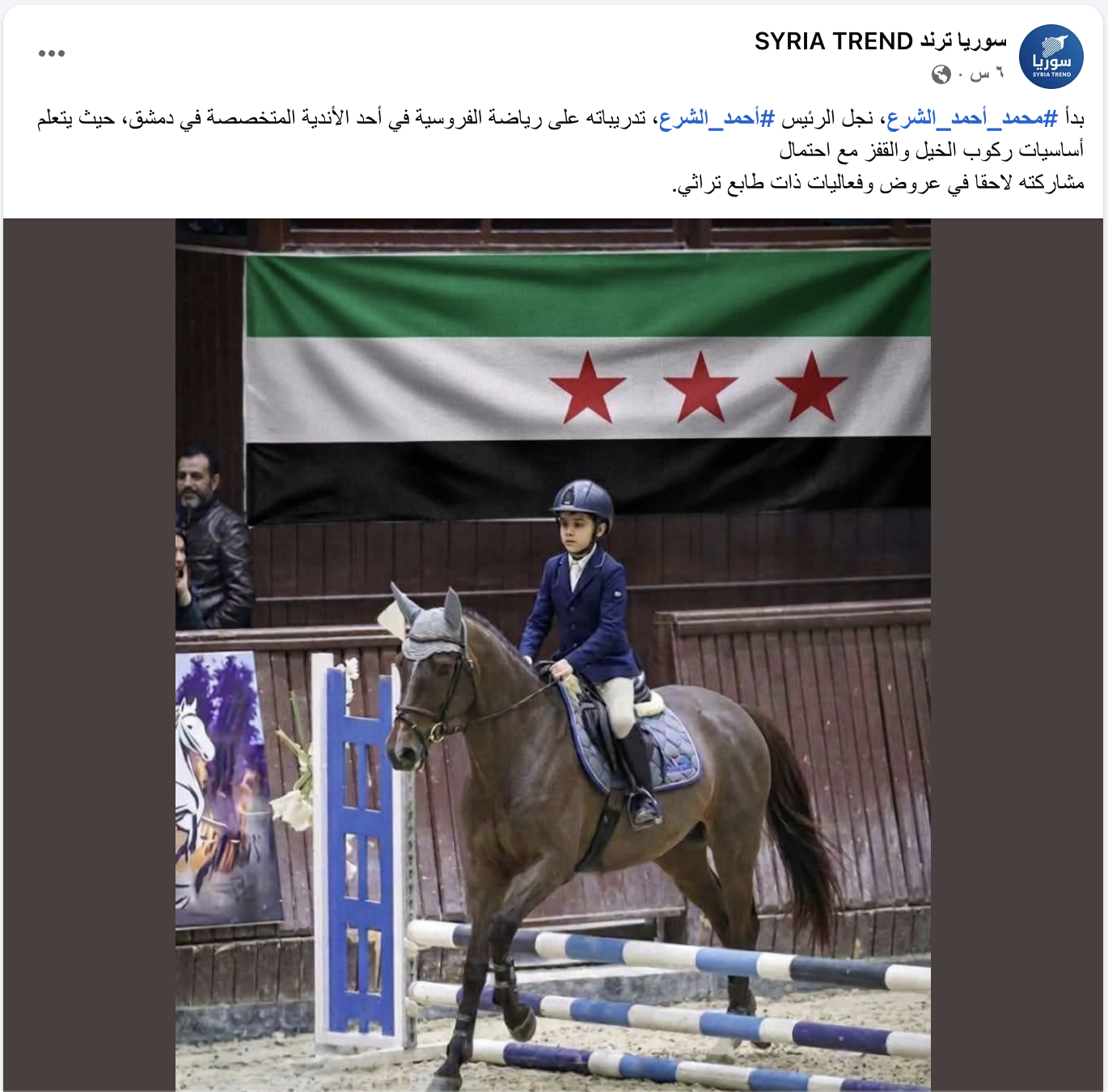 بدأ #محمد_أحمد_الشرع، نجل الرئيس #أحمد_الشرع، تدريباته على رياضة الفروسية في أحد الأندية المتخصصة في دمشق، حيث يتعلم أساسيات ركوب الخيل والقفز مع احتمال مشاركته لاحقا في عروض وفعاليات ذات طابع تراثي.