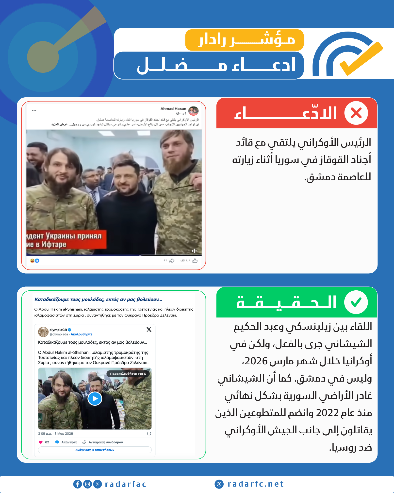 بالبحث العكسي في منصات التواصل الاجتماعي البحث وجدنا المقطع متداول قبل قبل شهر، إذ التقط أثناء مائدة إفطار رمضانية في كييف (أوكرانيا) خلال شهر رمضان وذلك في 2 آذار/مارس 2026، حيث التقى زيلينسكي بجنود مسلمين ومتطوعين شيشان يقاتلون في صفوف الجيش الأوكراني، من بينهم قائد قوات إشكيريا عبد الحكيم الشيشاني الذي كان مرتبطاً سابقاً بـ"أجناد القوقاز" في سوريا. إضافةً إلى ورود نص في المقطع باللغة الروسية، ترجمته: "شارك الرئيس الأوكراني فولوديمير زيلينسكي في مائدة إفطار مع العسكريين المسلمين في القوات المسلحة الأوكرانية". إذن، فقد خلُص لرادار، أنّ اللقاء لم يحدث في دمشق ولا يرتبط بزيارة زيلينسكي الأخيرة إلى سوريا (التي تمت فعلاً في نيسان/أبريل 2026).