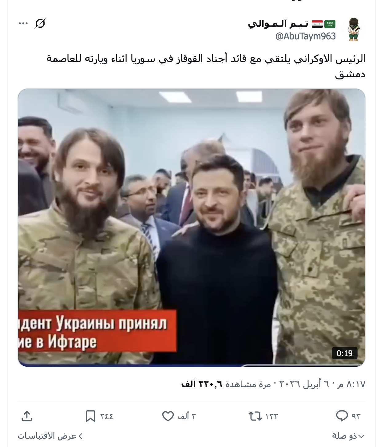 تداول مستخدمون وصفحات على منصات التواصل الاجتماعي مقطعاً يظهر الرئيس الأوكراني فولوديمير زيلينسكي بجانب قائد سابق لـ”أجناد القوقاز” (عبد الحكيم الشيشاني/Rustam Azhiev) وعناصر شيشان آخرين يرتدون الزي العسكري، مع تعليقات تقول إنه لقاء في دمشق أثناء زيارة زيلينسكي الأخيرة للعاصمة السورية.