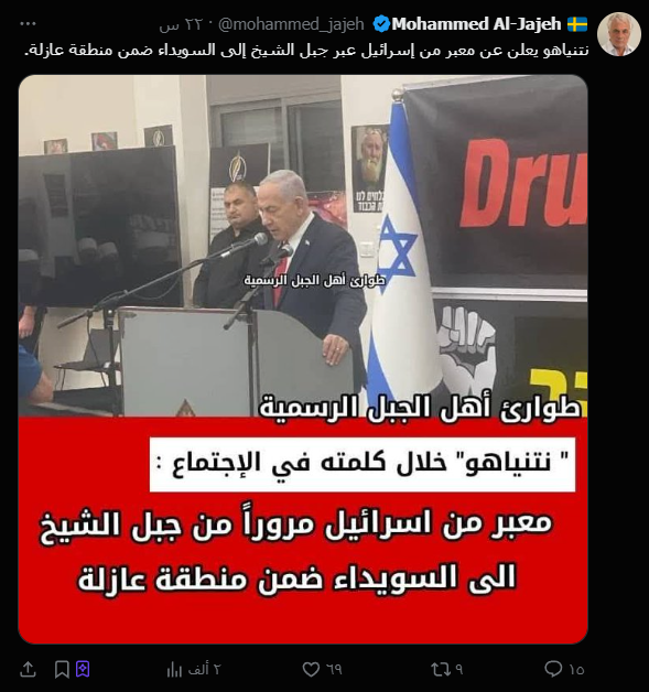 تداولت حسابات وصفحات على منصات التواصل الاجتماعي، تصريحا منسوبا لرئيس وزارء الكيان الإسرائيلي بنيامين ننتنياهو حول فتح معبر بري بين إسرائيل ومحافظة السويداء، مرورا بجبل الشيخ. ونسب كذلك ناشرو الادعاء بإن نتنياهو أعلن ذلك خلال اجتماع مع غرفة عمليات الدروز في إسرائيل، وأن المعبر سيكون ضمن منطقة عازلة.