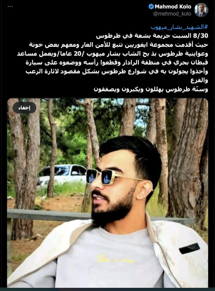 نشرت حسابات وصفحات ادعاء بأن الأمن العام قام بذبح شاب يدعى بشار مهيوب، وقطعوا رأسه، ومثلوا بجثته في شوارع مدينة طرطوس.