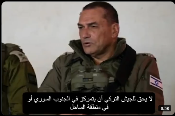 انتشر على منصة إكس مقطع فيديو مصوَّر لرئيس الأركان الإسرائيلي، يقول فيه إنه تم الاتفاق مع القادة الأتراك على موافقتهم لخطوط إسرائيل الحمراء، والتي تتضمن عدم إنشاء أي قاعدة عسكرية تركية أو إخوانية أو سنيّة في الجنوب السوري أو الساحل السوري، أو في المنطقة الممتدة من الجنوب السوري إلى الحدود العراقية مطلقًا.