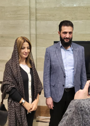 الصورة لمذيعة قناة العربية بجانب أحمد الشرع وليست زوجته