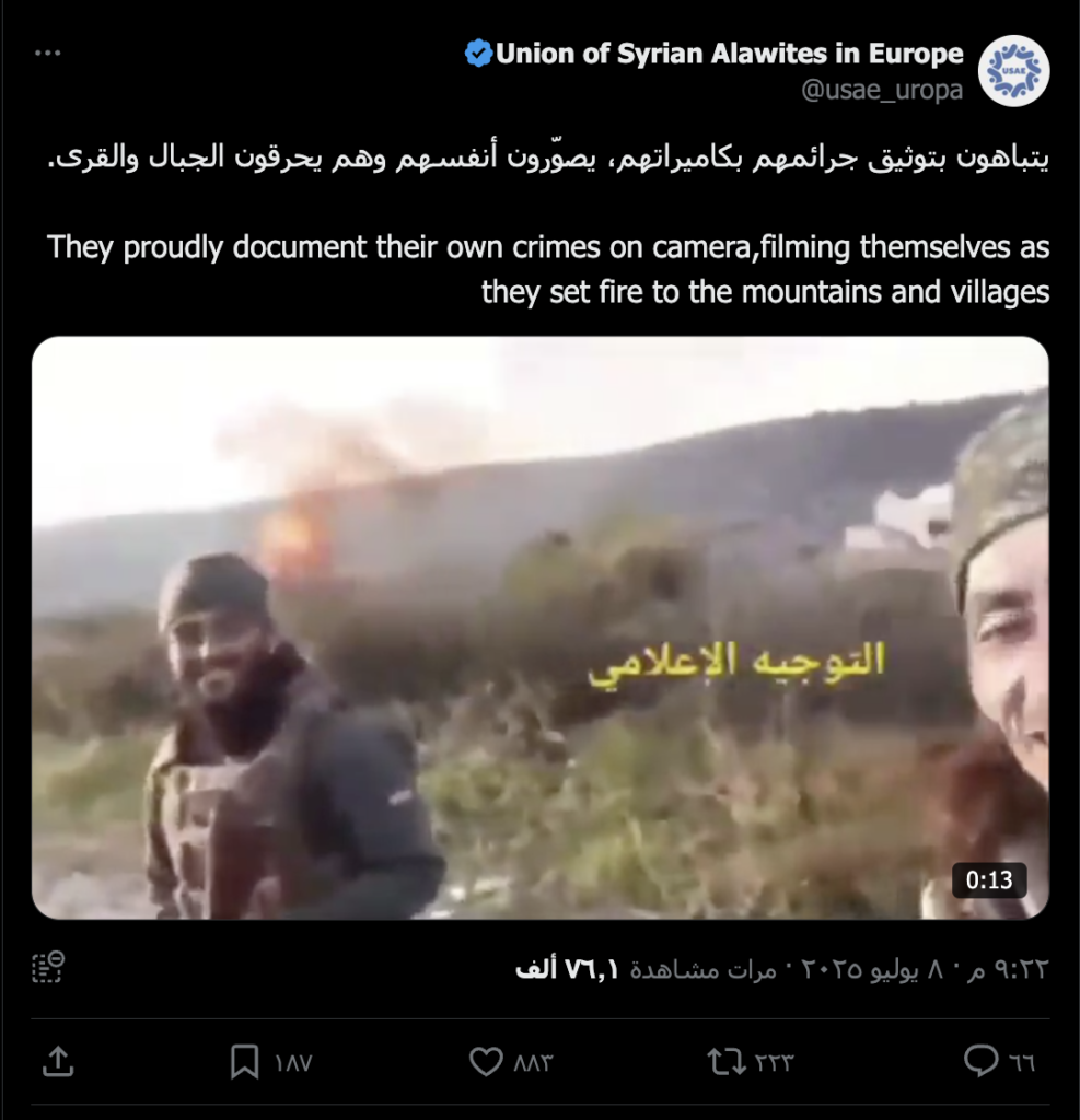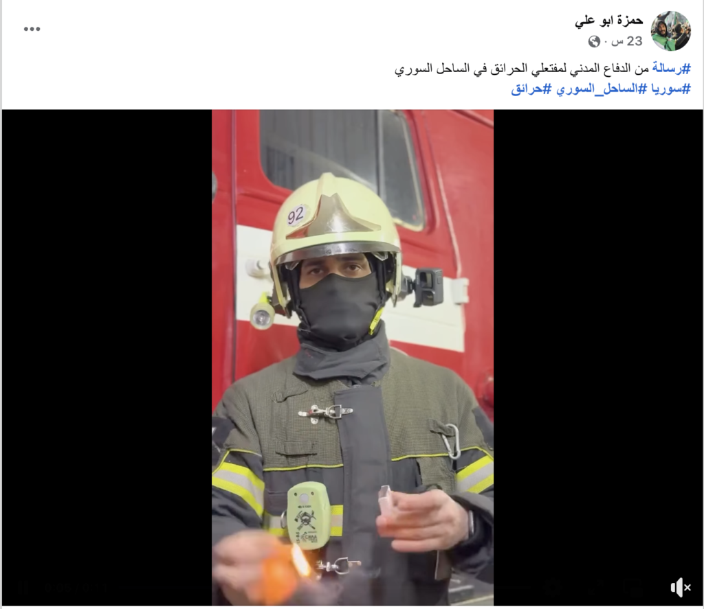 تداولت حسابات على وسائل التواصل الاجتماعي خلال الساعات الماضية مقطع فيديو يظهر عناصر عسكرية وخلفهم مشهد لحرائق مشتعلة، مع ادعاء بأنهم عناصر تابعة للحكومة السورية وأنهم يصوّرون أنفسهم أثناء إشعال النيران في الجبال والقرى.