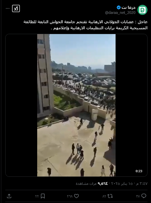 ادعت حسابات على منصة إكس، أن عناصر يتبعون للجولاني اقتحموا جامعة الحواش الخاصة.