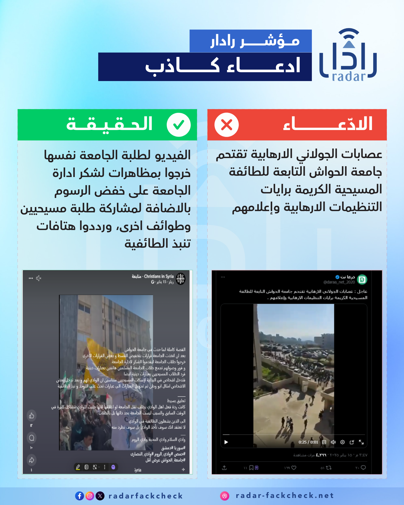 تحققنا من الفيديو في منصة رادار وتبين أنه، بعد ان اتخذت الجامعة قرارات بتخفيض القسط و بعض القرارات الاخرى خرجوا طلاب الجامعة ليقدموا الشكر لادارة الجامعة، و فور وصولهم تجمع طلاب الجامعة المسلمين هاتفين بعبارات دينية فرد الطلاب المسيحيين بعبارات دينية ايضا، وبعد تدخل بعض الاشخاص من بينهك ابو وطن تم تحويل العبارات الى عبارات تحث على التوحد و نبذ الطائفية.
