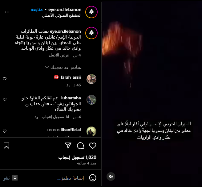 تدوالت حسابات على منصات التواصل الاجتماعي تسجيل مصور لانفجار قالوا أنه نتيجة غارات جوية إسرائيلية على منطقة وادي خالد وعكار قرب الحدود اللبنانية السورية.