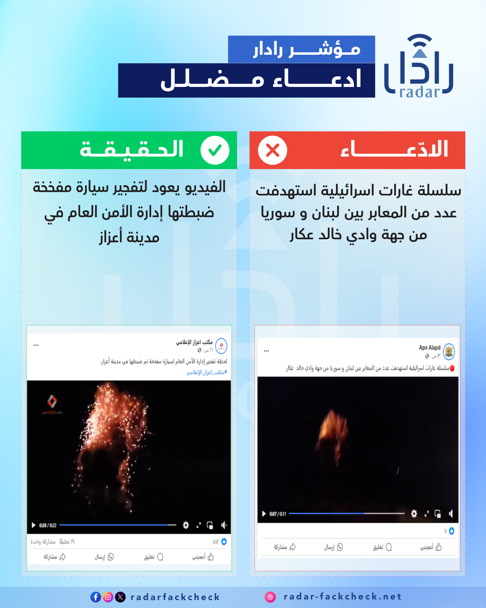أجرى فريق منصة رادار تدقيقاً حول الفيديو المتداول، ووجد أنه يعود لتفجير سيارة مفخخة ضبطتها إدارة الأمن العام في مدينة أعزاز شمال حلب.