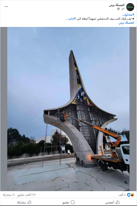 ادعت صفحات على فيس بوك، تفكيك نصب السيف الدمشقي من ساحة الأمويين في دمشق تهميداً لنقله إلى إدلب.