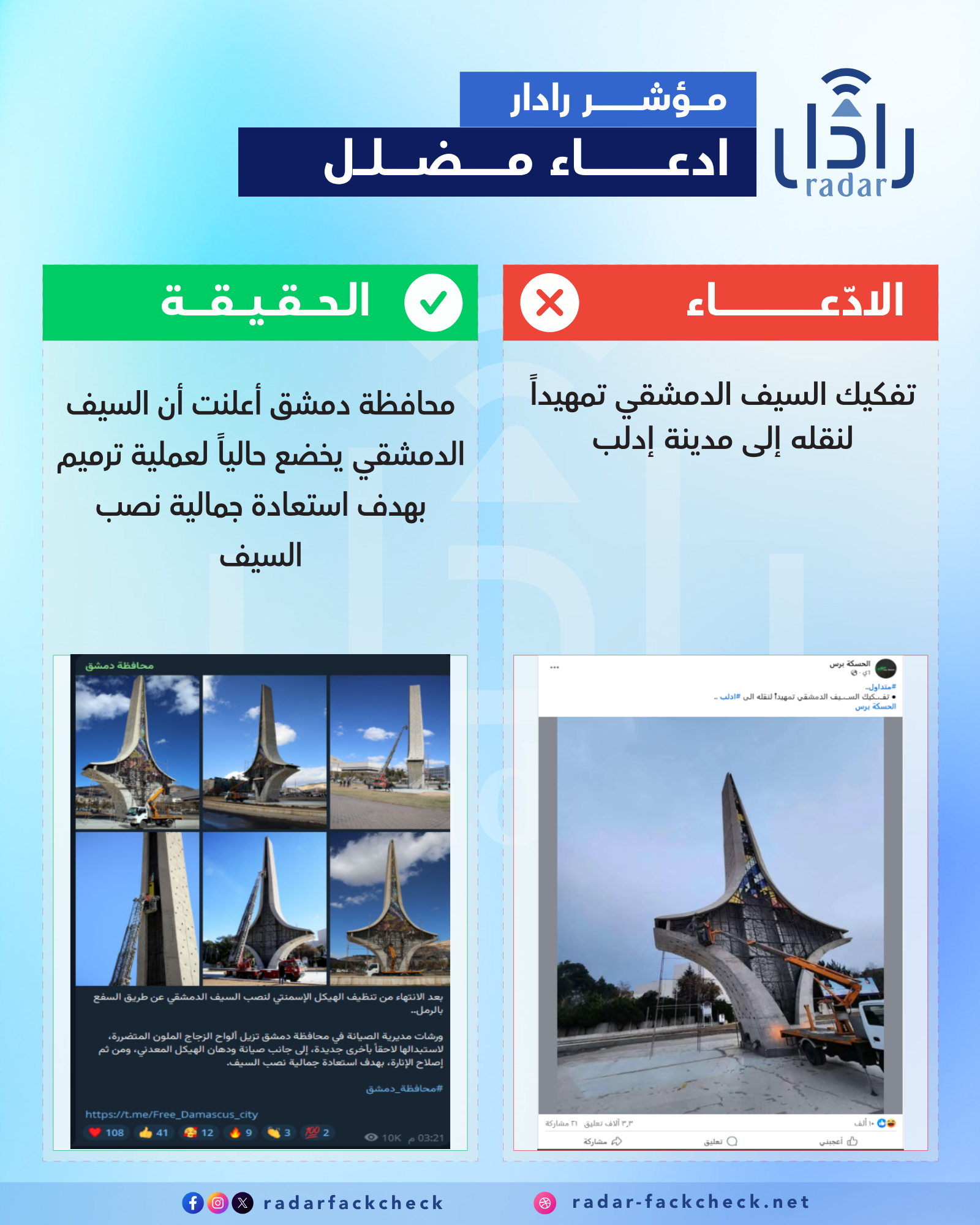 تحقق فريق منصة رادار من صحة الادعاء وتبين أن السيف الدمشقي يخضع لعملية ترميم حسب ما أعلنت محافظة دمشق عبر حسابها الرسمي على تيليغرام، أنه بعد الانتهاء من تنظيف الهيكل الإسمنتي لنصب السيف الدمشقي عن طريق السفع بالرمل، بدأت ورشات مديرية الصيانة في محافظة دمشق تزيل ألواح الزجاج الملون المتضررة، لاستبدالها لاحقاً بأخرى جديدة، إلى جانب صيانة ودهان الهيكل المعدني، ومن ثم إصلاح الإنارة، بهدف استعادة جمالية نصب السيف.