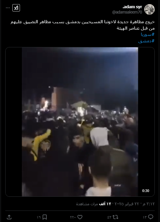 ادعت حسابات على منصة إكس خروج المسحيين بمظاهرة في مدينة دمشق نتيجة التضييق عليهم من قبل هيئة تحرير الشام.