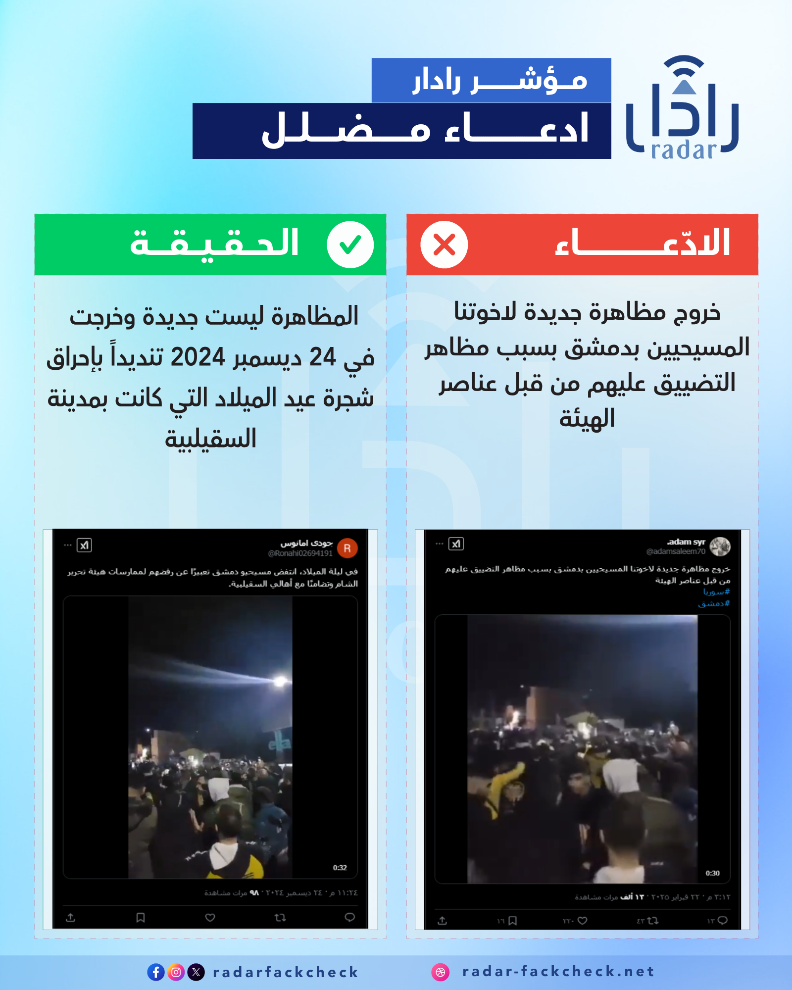 أجرى فريق منصة رادار تدقيقاً حول الفيديو المتداول للمظاهرة، ومن خلال البحث وجد أن الفيديو يعود لتاريخ 24 ديسمبر 2024، حينها خرج عشرات المسيحيين في مظاهرة تنديداَ بحرق شجرة الميلاد في مدينة السقيلبية.