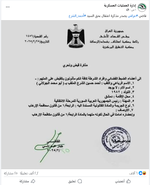 تداول مستخدمو وسائل التواصل الاجتماعي صوراً لمذكرات اعتقال بحق كل من الرئيس السوري السيد أحمد الشرع، والرئيس الأمريكي دونالد ترمب وعضو الكونغرس جو ويلسون، قالوا أنها صادرة عن مجلس القضاء الأعلى العراقي.