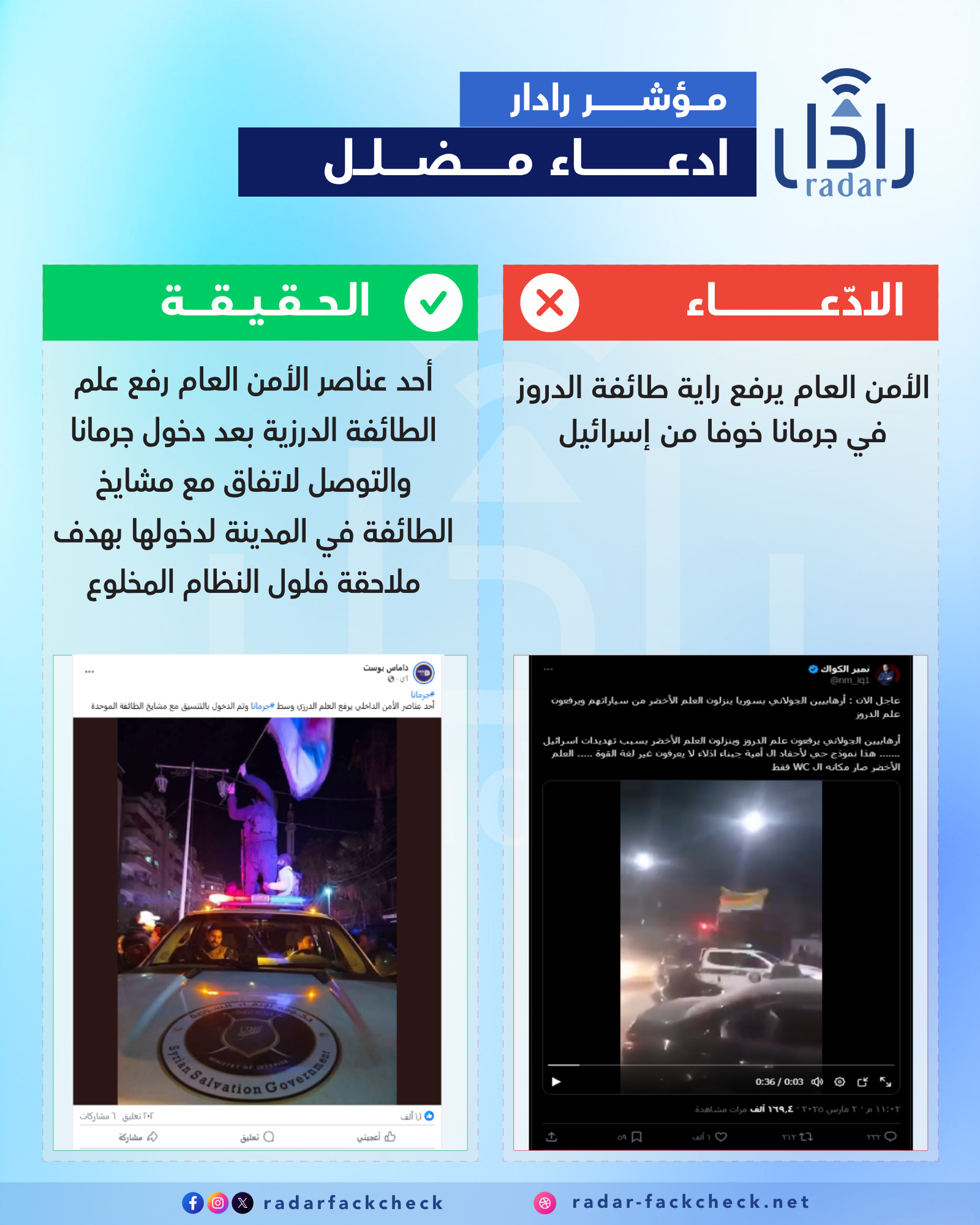 أجرى فريق منصة رادار بحثاً عن الصورة المتداولة لمعرفة سبب رفع الأمن العام علم الطائفة الدرزية، ووجد أنه بعد التوصل لاتفاق مع مشايخ الطائفة لدخول مدينة جرمانا تم رفع العلم من قبل أحد العناصر كمبادرة شخصية منه دون سبب.