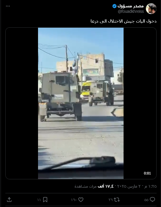 ادعت حسابات على منصة إكس دخول الجيش الإسرائيلي لمحافظة درعا.