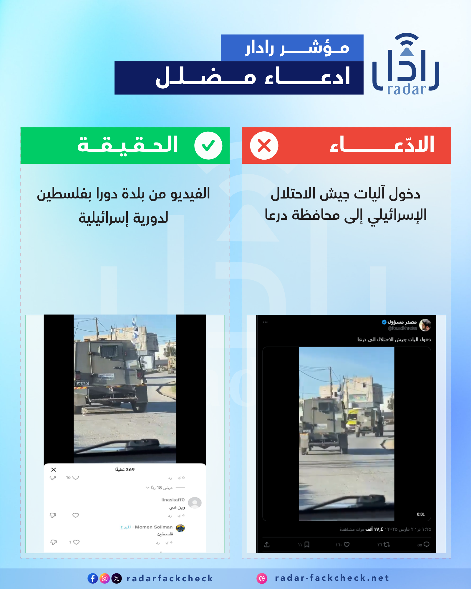 أجرى فريق منصة رادار تدقيقاً حول الفيديو المتداول عن دخول آليات إسرائيلية إلى درعا، ووجد أن الفيديو تم تصويره قبل عدة أيام في بلدة دورا الفلسطينية لدورية للجيش الإسرائيلي.