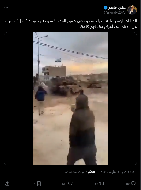 تداولت صفحات وحسابات على مواقع التوصل الاجتماعي فيديو قالوا أنه لدخول الدبابات الإسرائيلية لعمق المدن السورية.