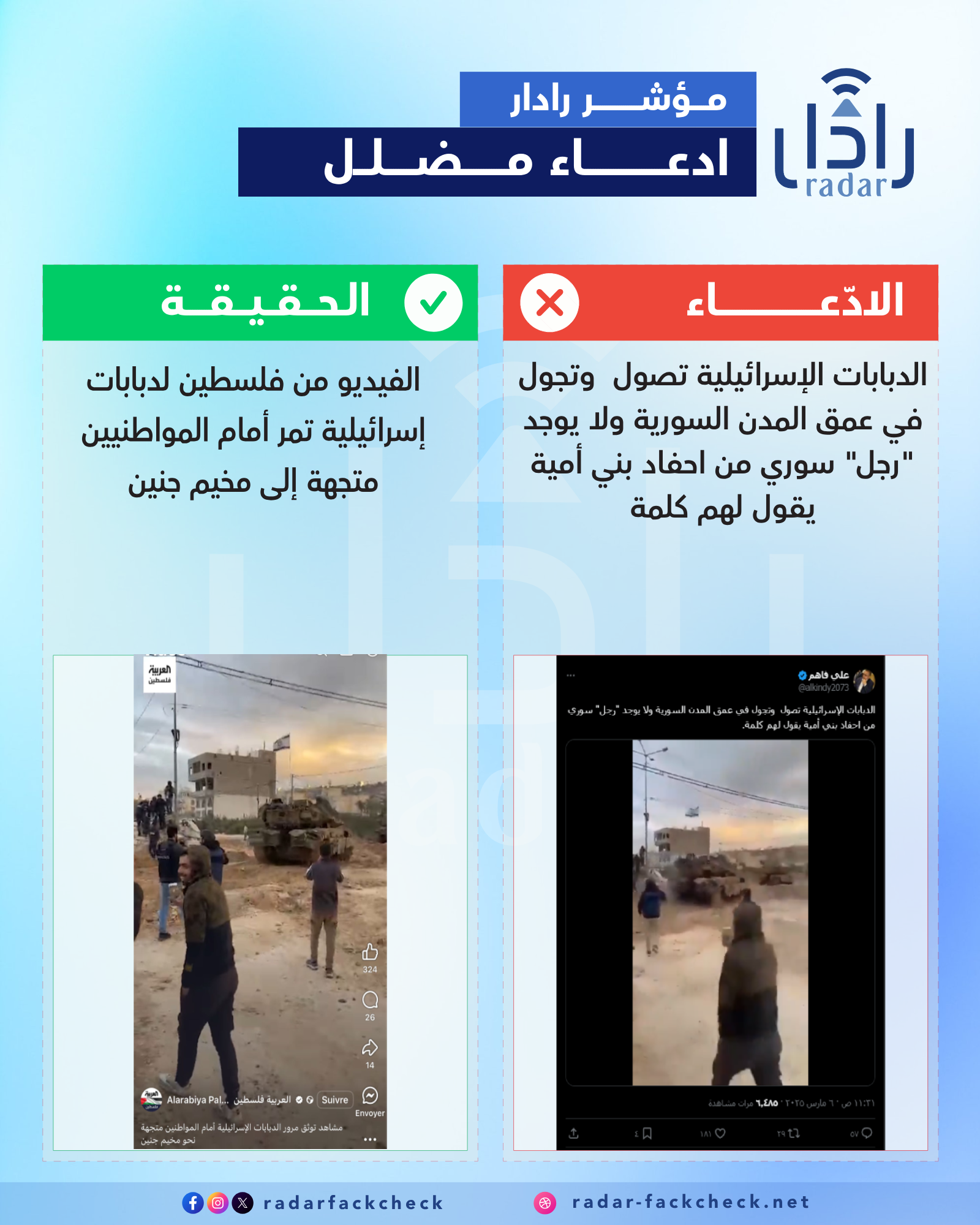 أجرى فريق منصة رادار بحثاً عن أصل الفيديو المتداول، ووجد أنه تم تصويره في فلسطين لدبابات إسرائيلية كانت متجهة نحو مخيم جنين مروراً أمام المواطنيين،وذلك في فبراير الفائت.
