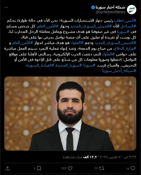 أنس خطاب رئيس استخبارات سوريا يعلن حالة الطوارئ في الساحل السوري، ويعلن أن كل مسلح من غير الحكومة هو هدف مشروع..