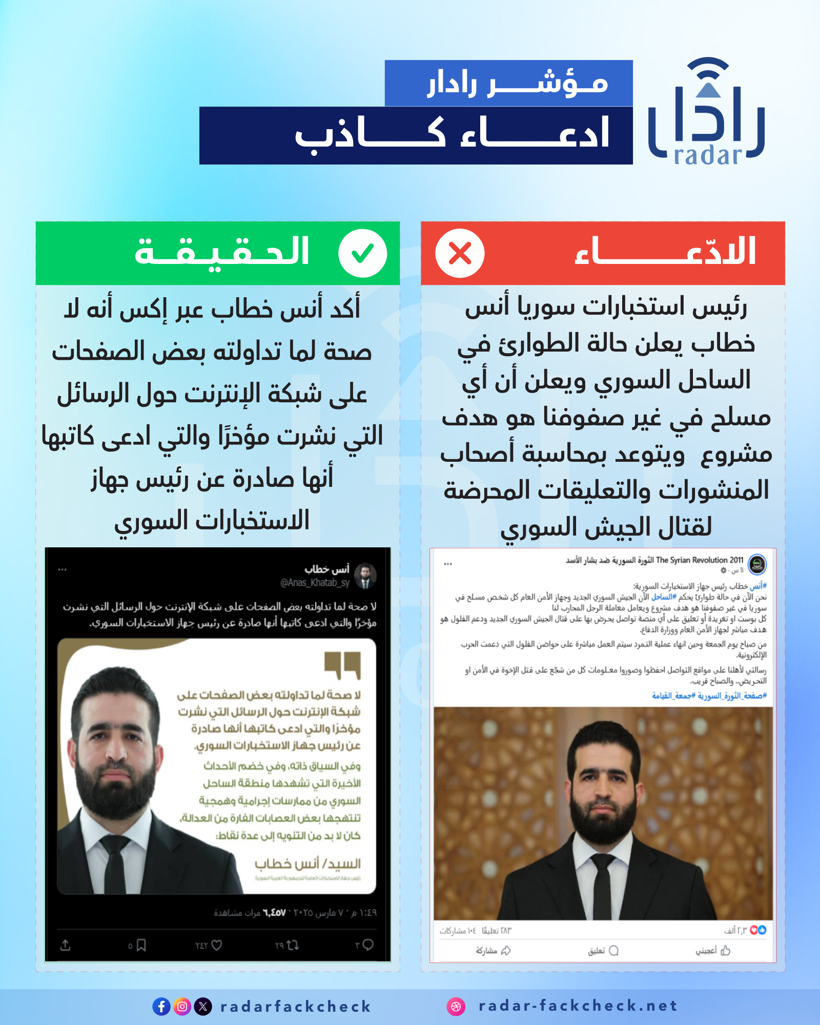 ادعت صفحات وحسابات على مواقع التواصل الاجتماعي أن رئيس جهاز الاستخبارات السوري أعلن حالة الطورائ في الساحل السوري، وأكد أن كل شخص مسلح في غير صفوف الحكومة الجديدة هو هدف مشروع، وأشار إلى متابعة كافة المنشورات والتعليقات التي تحرض على قوات الأمن والجيش السوري.