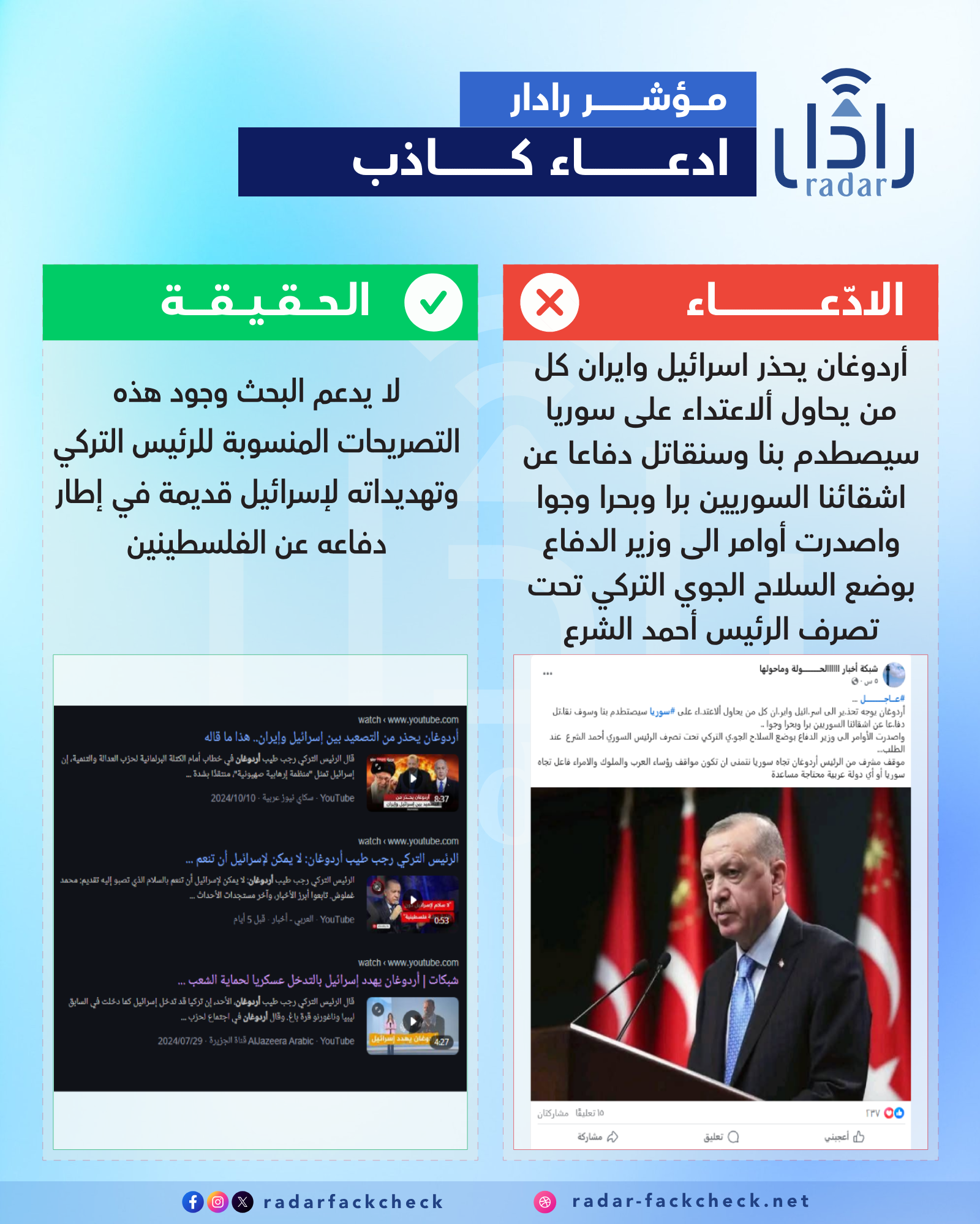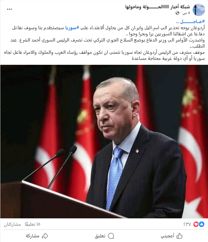 نسبت صفحات وحسابات على مواقع التواصل الاجتماعي، تصريحات للرئيس التركي رجب طيب أردوغان يحذر بها إيران وإسرائيل من الاعتداء على السوريين، ويعد بالقتال والدفاع عن السوريين براً وبجراً وجواً، وإصدار أوامر لوزير الدفاع بوضع سلاح الجو التركي تحت تصرف الرئيس السوري أحمد الشرع.