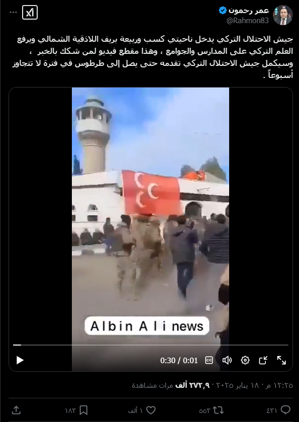 تداول رواد مواقع التواصل الاجتماعي فيديو وأخبار عن دخول الجيش التركي لمحافظة اللاذقية، ودخل ناحية كسب وربيعة بريف اللاذقية الشمالي ورفع العلم التركي على المدارس والجوامع، كما أشاروا إلى أن الجيش التركي سيواصل تقدمه حتى يسيطر على بانياس وطرطوس.