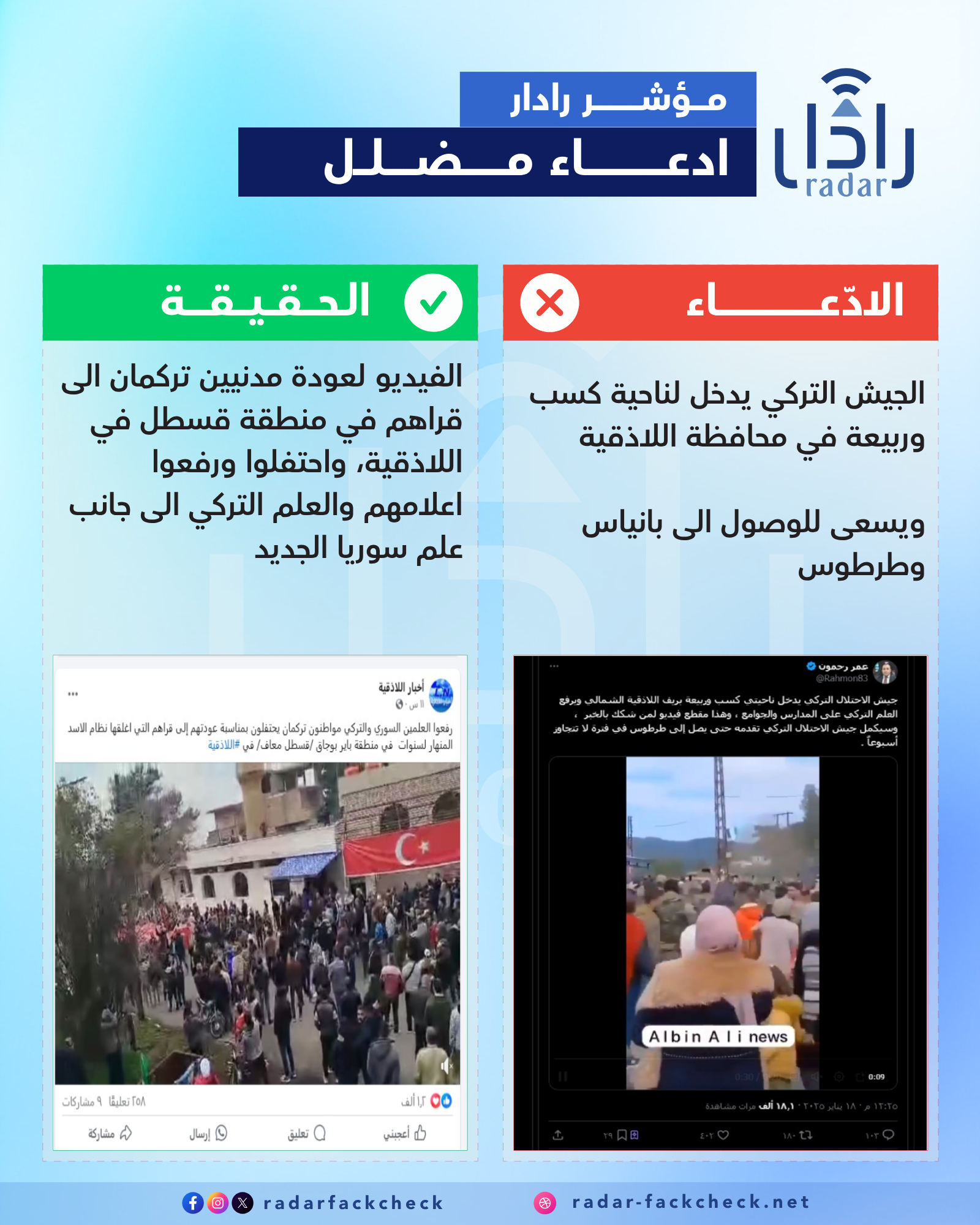 دقق فريق منصة رادار الفيديو ، وتبين أنه يعود لمدنيين من التركمان عادوا إلى قراهم بعد سنوات طويلة من تهجيرهم منها. وأكدت مصادر محلية لمنصة رادار، أن التركمان قد عادوا من تركيا وبعض المخيمات في احتفال كبير لقراهم، ورفعوا رايات تخصهم بالاضافة للعلم التركي كونه يرمز لقومتيهم التركية. وأشارت المصادر أنه سيكون هناك مهرجان احتفالي آخر في قراهم اليوم، كما أنهم يملكون كتيبة عسكرية قديمة منضوية ضمن ادارة العمليات العسكرية.