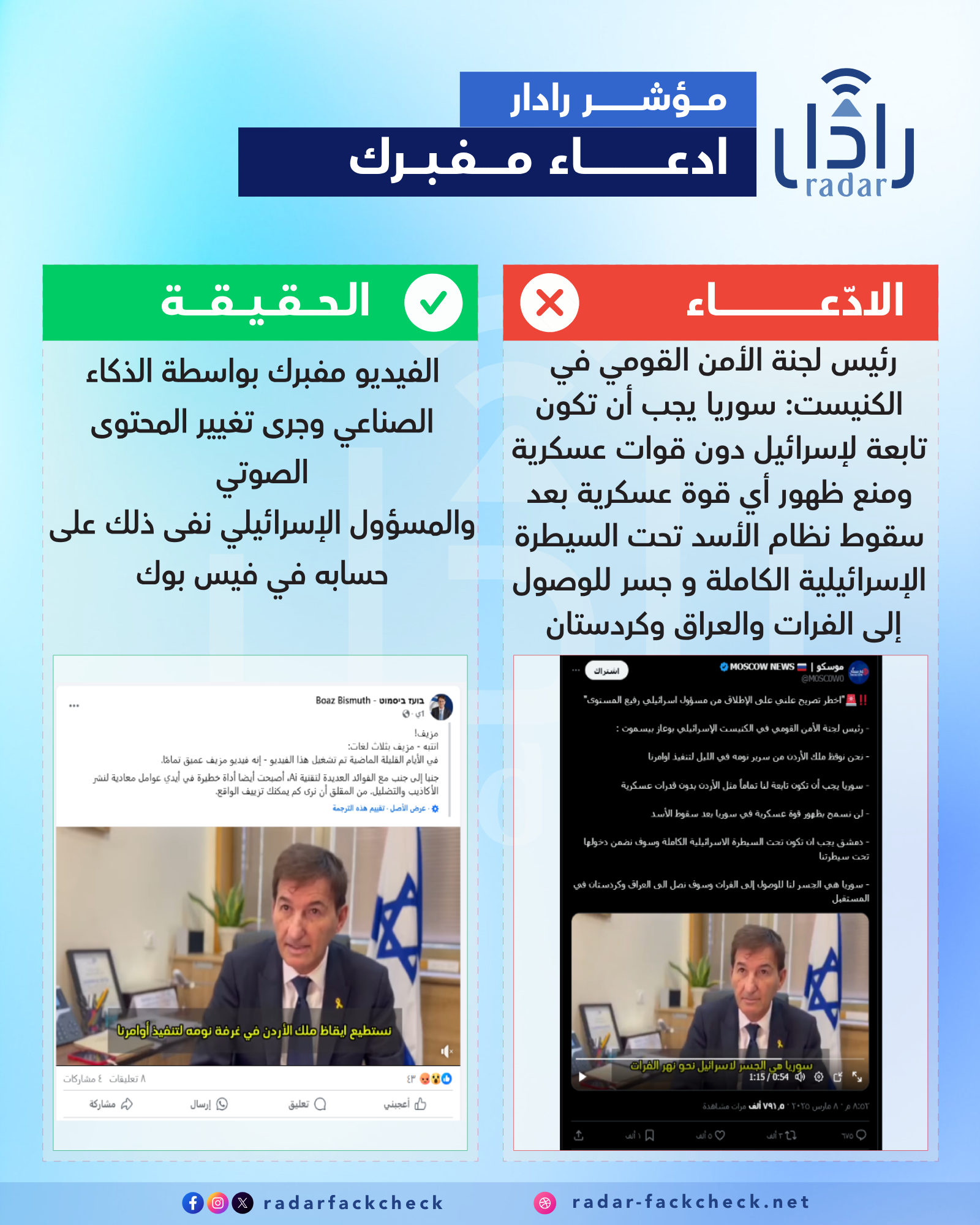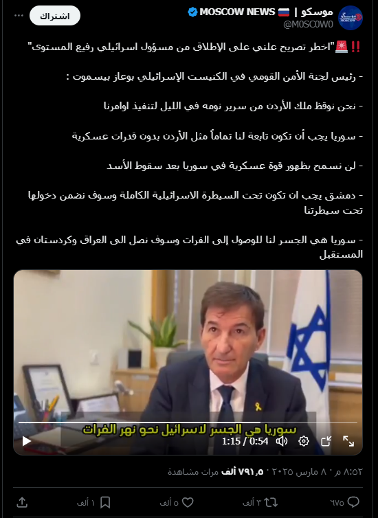 تداولت صفحات وحسابات على منصات التواصل الاجتماعي مقطع فيديو يُنسب إلى مسؤول إسرائيلي يُدعى بوعاز بيسموت، يتحدث فيه عن ضرورة تبعية سوريا لإسرائيل، وإخضاع الأردن لسيطرتها، بالإضافة إلى تأكيده على منع وجود قوات عسكرية في سوريا بعد سقوط نظام الأسد، وزعمه أن دمشق ستكون تحت السيطرة الإسرائيلية الكاملة، وأنها ستكون جسرًا للوصول إلى مناطق الفرات والعراق وكردستان.