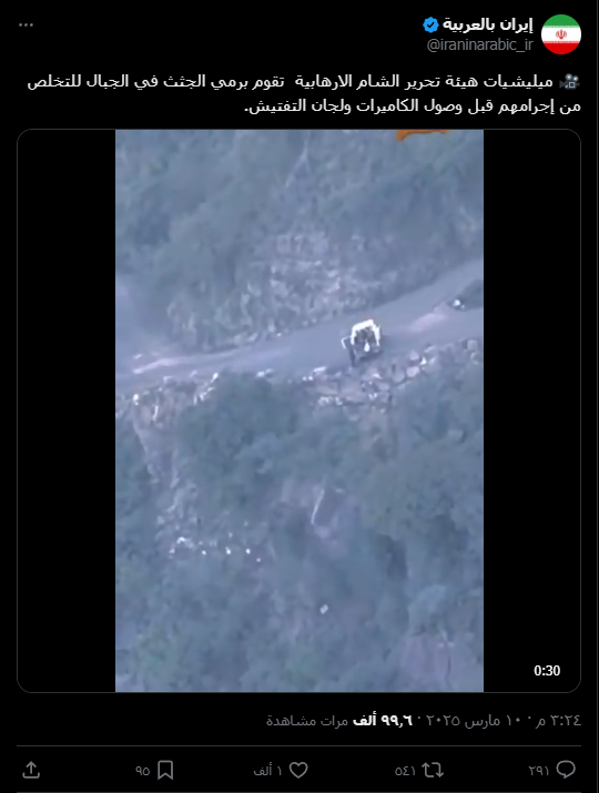 تداولت صفحات وحسابات على مواقع التواصل الاجتماعي، فيديو لعدة أشخاص في سيارة من نوع بيك اب في أحد الجبال، قالوا أنهم عناصر الحكومة يقومون برمي جثث السوريين في الوديان والجبال.