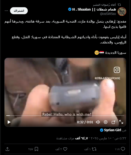 انتشر على منصة إكس تسجيل مصور لعناصر يتصلون بوالدة شخص يدعى "مازن" ويخبرونها بذبح ابنها، مدعين أنهم من جند الأقصى.