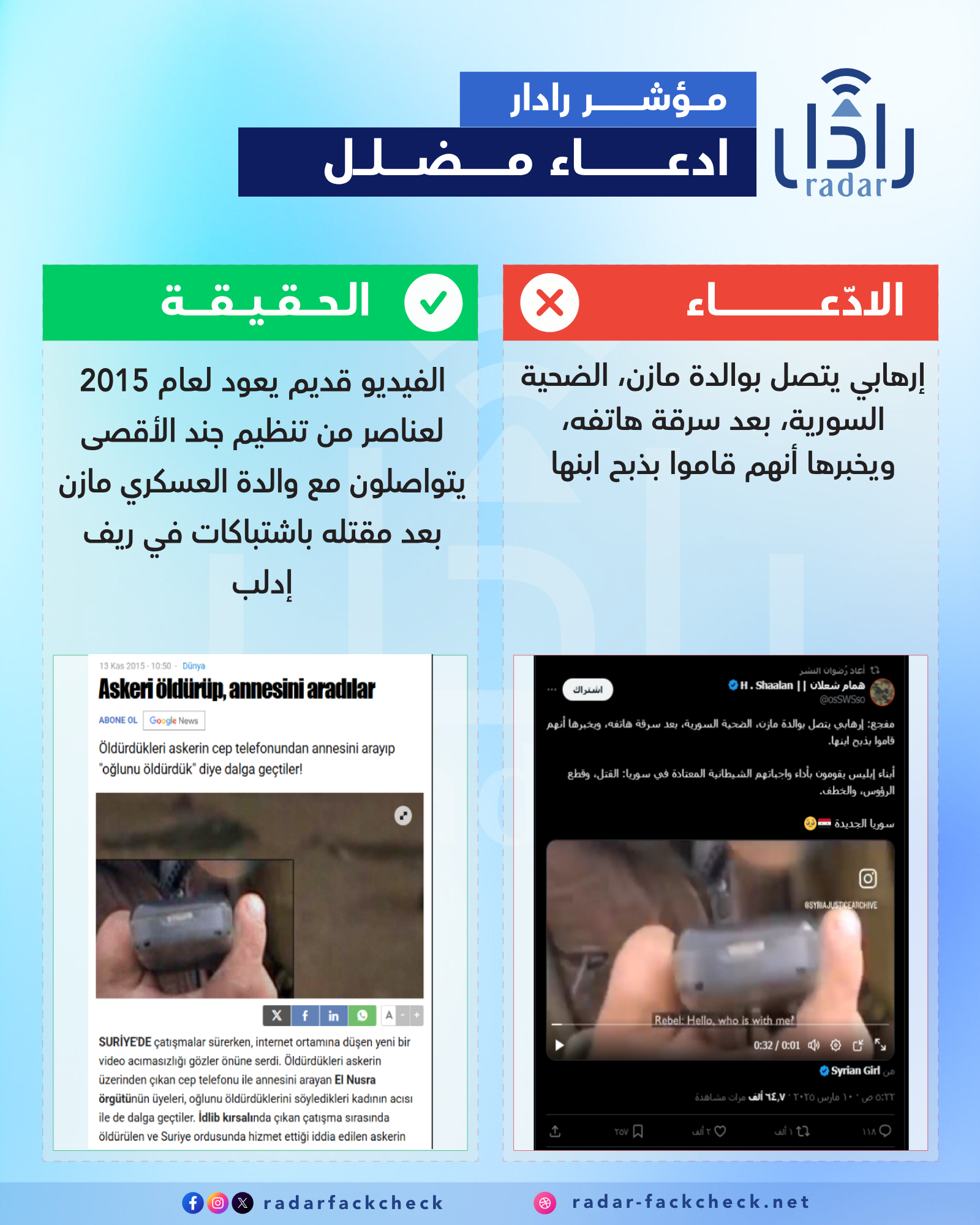 أجرى فريق منصة رادار بحث عن أصل الفيديو، ووجد أن الفيديو قديم يعود لعام 2015 لعناصر من تنظيم جند الأقصى يتواصلون مع والدة العسكري مازن بعد مقتله باشتباكات في ريف إدلب.