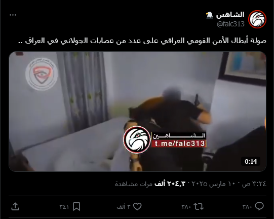 نشرت حسابات على منصة “إكس” مقطع فيديو يدعي أنه يُظهر جهاز الأمن العراقي وهو ينفذ حملة اعتقالات ضد عدد من عصابات الجولاني في العراق. وقد لاقى الفيديو انتشارًا واسعًا.