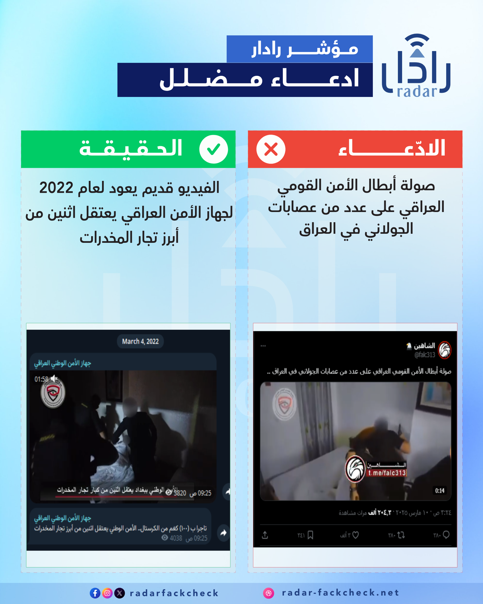 أجرى فريق منصة رادار تحقيقاً سريعا للفيديو ومن خلال البحث تبيّن أن المقطع مضلل ولا يرتبط بالواقع الحالي، حيث الفيديو يعود لتاريخ 2022، لعملية اعتقال نفذها جهاز الأمن العراقي ضد اثنين من أبرز تجار المخدرات في ذلك الوقت.