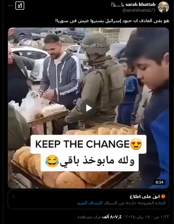 زعمت حسابات على منصة إكس أن جنود اسرائيلين يقومون بشراء الخبز في سوريا.