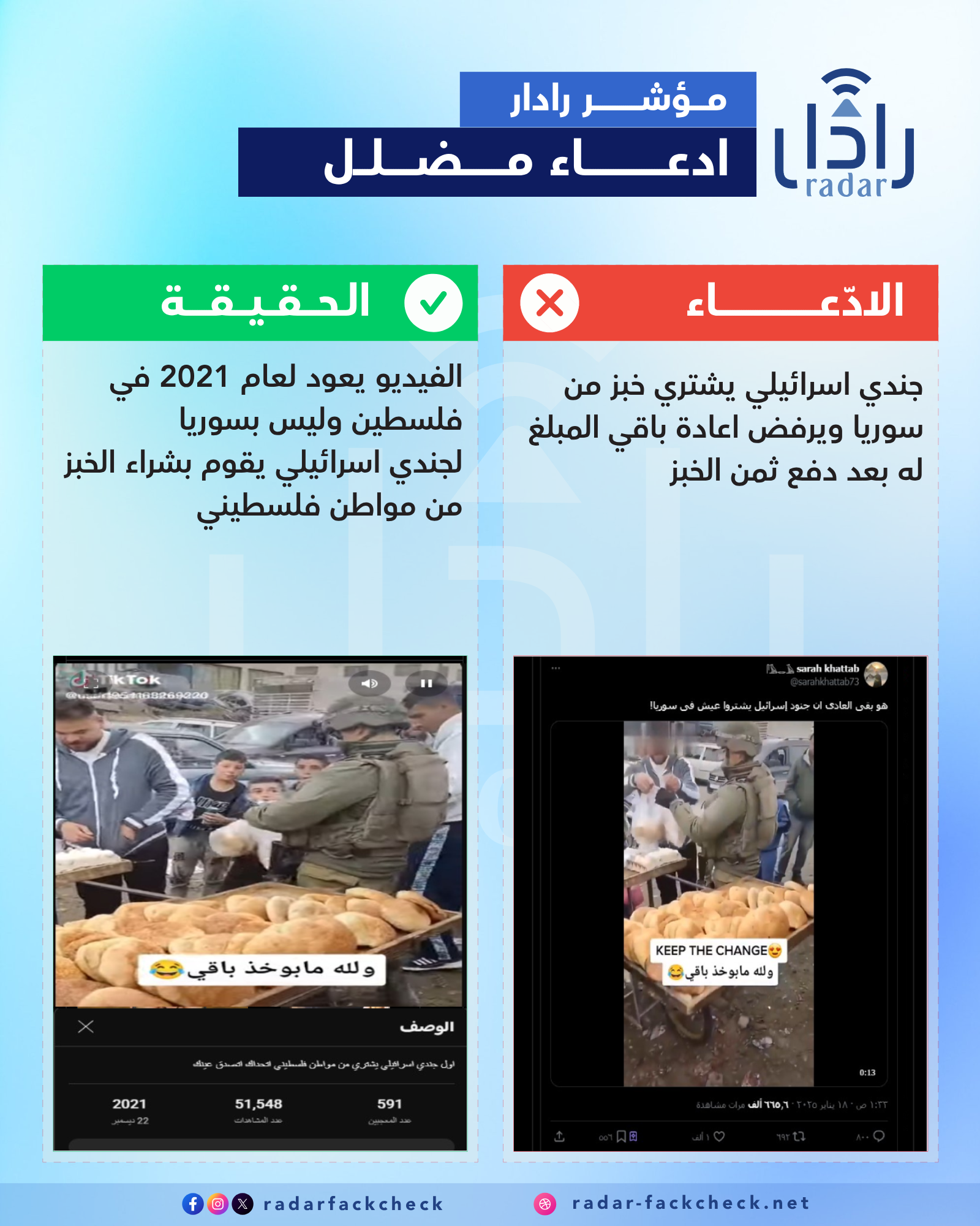 بحثنا في منصة رادار عن أصل الفيديو من خلال أدوات البحث وتبين أنه قديم ويعود تاريخه لعام 2021، في فلسطين، لجندي اسرائيلي يشتري الخبز من بائع فلسطيني متجول.