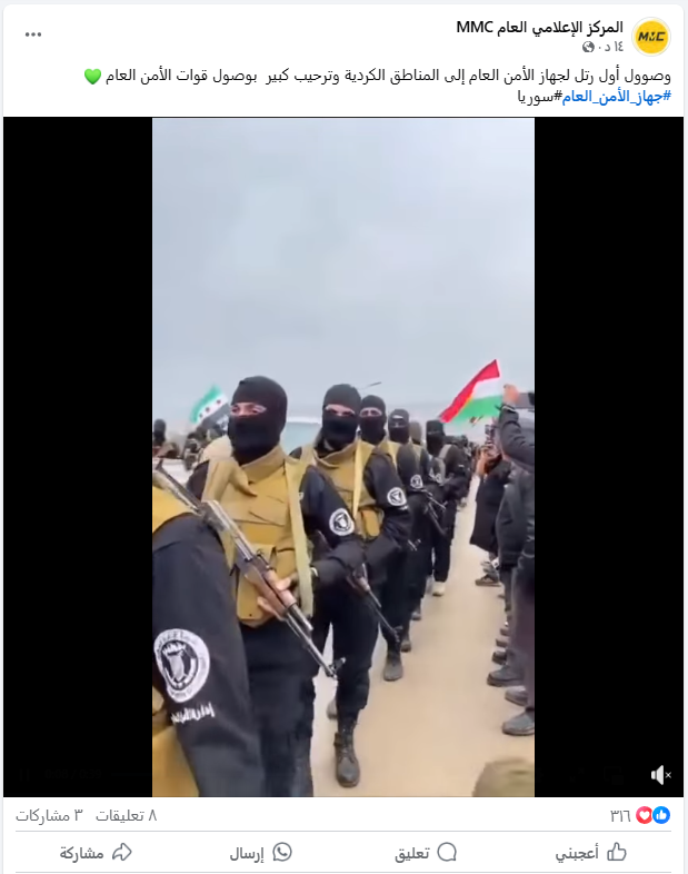 تداولت صفحات على موقع فيس بوك، تسجيل مصور لعناصر من إدارة الأمن العام قالوا أنهم دخلوا إلى مناطق سيطرة قسد وسط ترحيب حار من الأكراد، وذلك عقب توقيع الاتفاقية بين الحكومة وقسد.