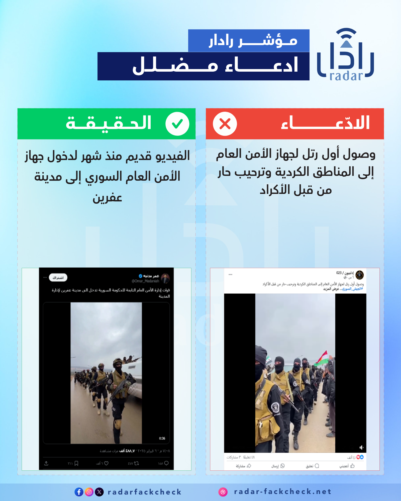 أجرى فريق منصة رادار تدقيقاً حول الفيديو المتداول، ووجد أنه قديم ويعود لتسلم الأمن العام مدينة عفرين من الفصائل العسكرية وإدارتها أمنياً، بعد سقوط النظام السوري، ودمج الفصائل بوزارة الدفاع السورية.