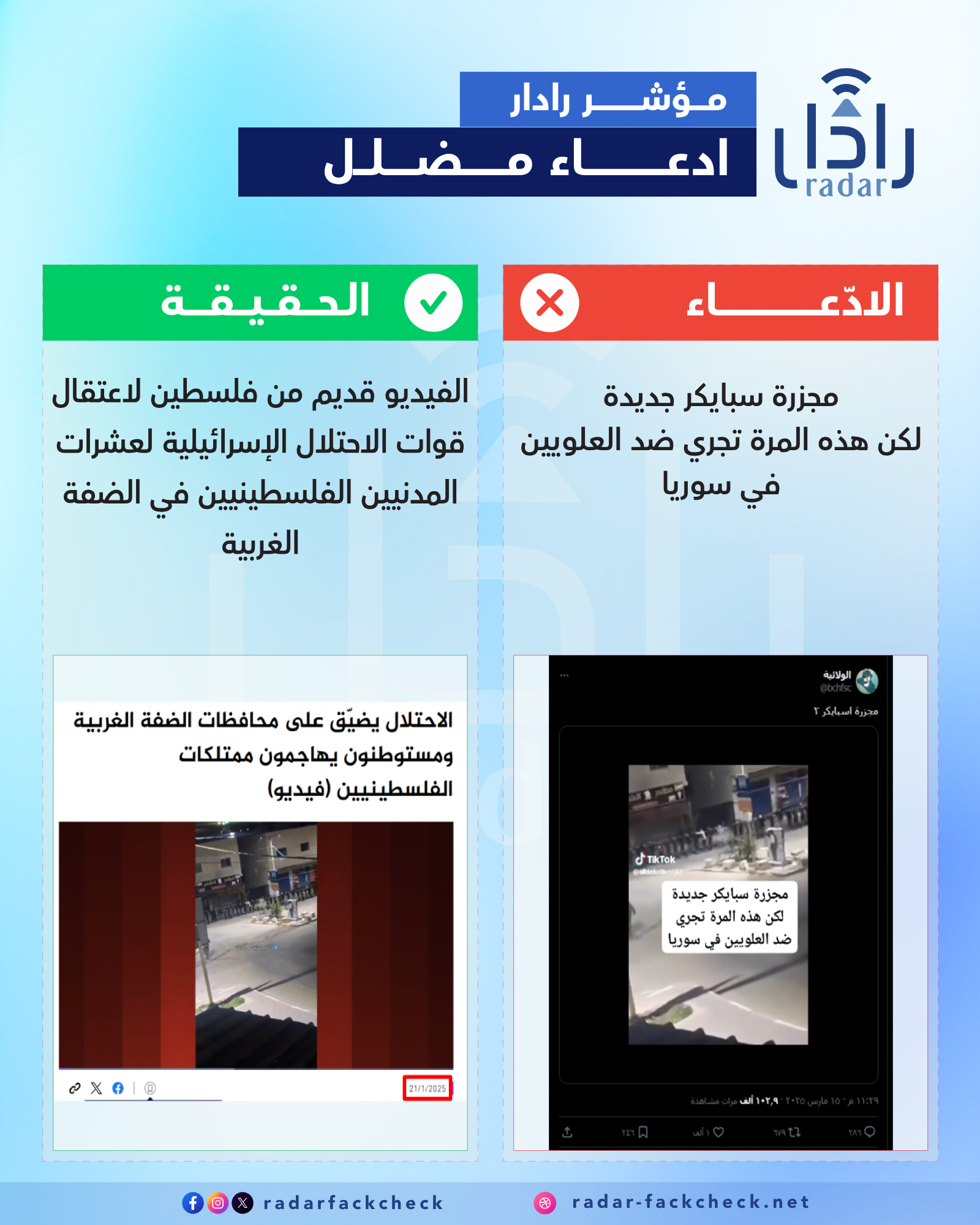 أجرى فريق منصة رادار بحثاً عن الفيديو المتداول، ووجد أنه من فلسطين لاعتقال مدنيين في الضفة الغربية، وذلك في الشهر الأول من هذا العام.