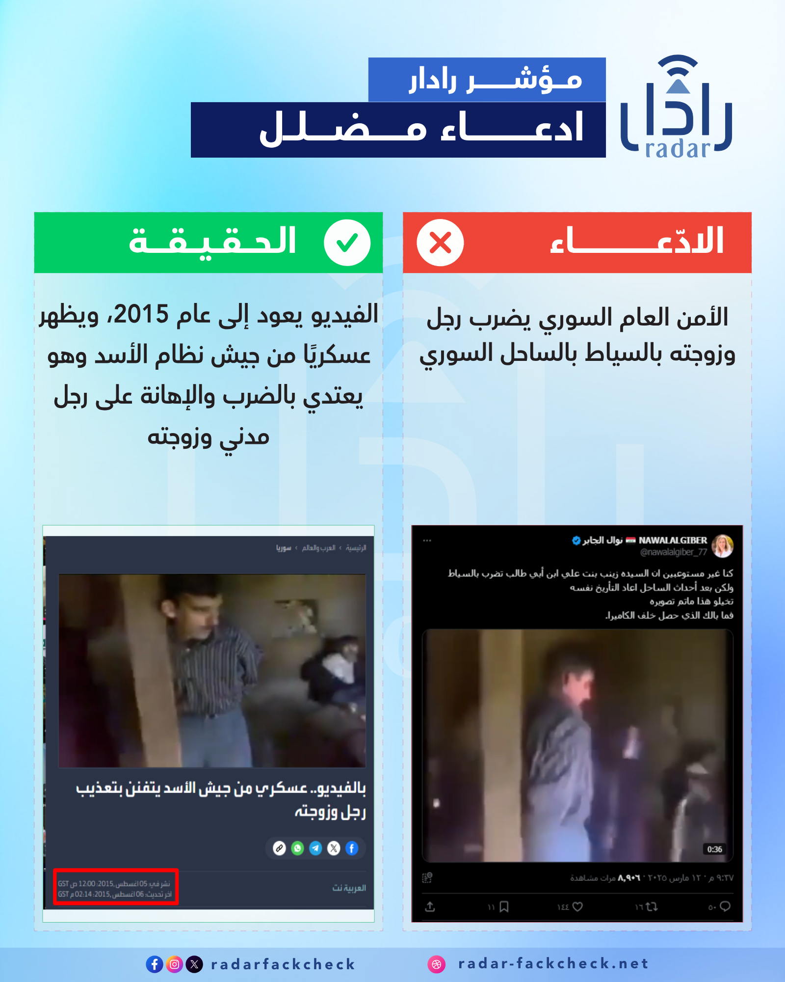 أجرى فريق منصة رادار تدقيقاً حول الفيديو المتداول، ووجد أن الفيديو يعود إلى عام 2015، ويظهر عسكريًا من جيش نظام الأسد وهو يعتدي بالضرب والإهانة على رجل مدني وزوجته
