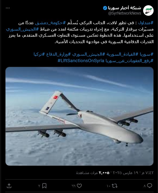 ادعت حسابات على منصة إكس أن تركيا سلمت حكومة دمشق عددًا من الطائرات المسيرة من نوع بيرقدار، إلى جانب إجراء تدريبات مكثفة لضباط الجيش السوري على استخدامها. ووفقًا لهذه الادعاءات، فإن هذه الخطوة تعكس مستوى متقدمًا من التعاون العسكري بين الجانبين، مما قد يعزز القدرات الدفاعية السورية في مواجهة التحديات الأمنية الحالية.
