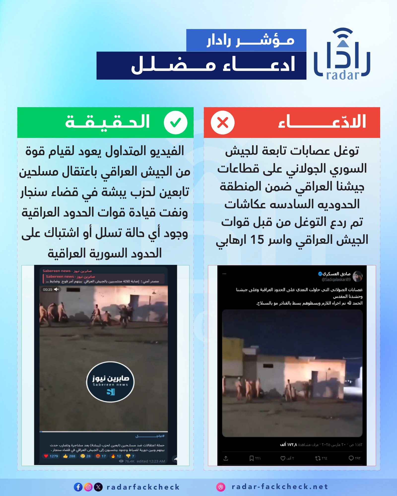 أجرى فريق منصة رادار بحثاً حول الفيديو المتداول، وتبين أن الجيش العراقي شن حملة اعتقالات ضد مسلـحين تابعين لحزب (يبشة) بعد مشاجرة وتضارب حدث بينهم وبين دورية لضباط وجنود ينتسبون إلى الجيش العراقي في قضاء سنجار، ومن جانب آخر نفت قيادة قوات الحدود العراقية وجود أي حالة تسلل أو اشتباك على الحدود السورية العراقية.