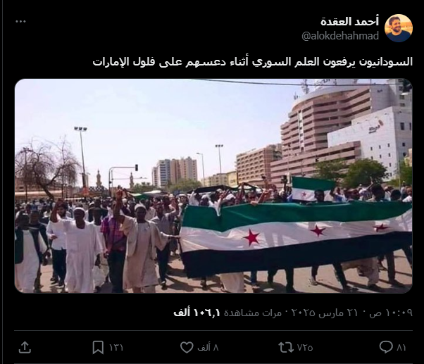 “انتشرت صورة على منصة إكس، ادَّعى متداولوها أنها تُظهر الشعب السوداني وهو يرفع العلم السوري أثناء دعسه على ما وُصِف بـ”فلول الإمارات”.
