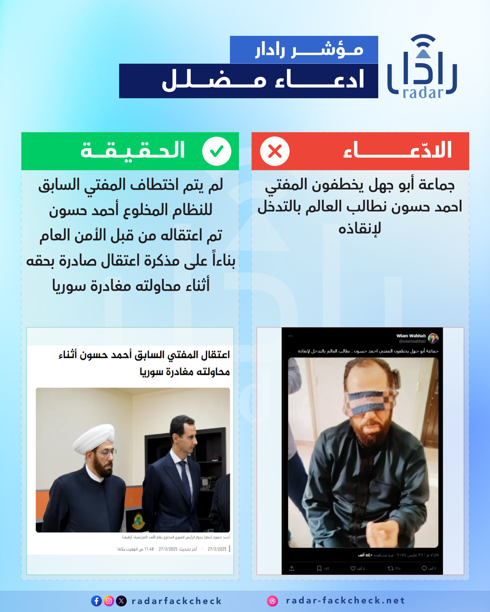 أجرى فريق منصة رادار بحثاً حول الأنباء المتداولة عن اختطاف المفتي السوري السابق أحمد بدر الدين حسون، وتوصل إلى أن الأمن العام السوري ألقى القبض عليه بناءً على مذكرة توقيف صادرة عن النيابة العامة، حيث تم اعتقاله في مطار دمشق الدولي أثناء محاولته مغادرة البلاد إلى وجهة غير معلنة.