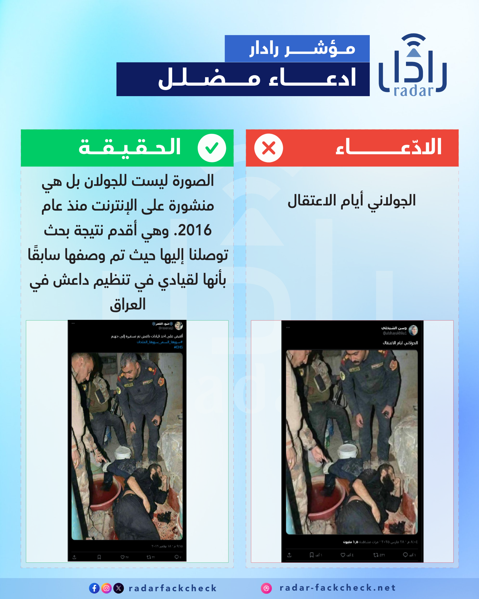 أجرى فريق منصة رادار بحثًا عن الصورة، وتوصل إلى أنها لا تعود للجولاني. وكشفت أقدم نتيجة بحث توصل إليها الفريق أن الصورة نُشرت على الإنترنت في نوفمبر 2016، حيث نُسبت آنذاك إلى أحد قيادات تنظيم داعش في العراق، دون تأكيد هويته الحقيقية أو ما إذا كان معتقلًا أو قد أُلقي القبض عليه حديثًا في ذلك الوقت.