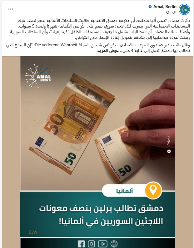 تداولت صفحات على موقع "فيسبوك"، أنباء تفيد بأن حكومة دمشق طالبت برلين بنصف معونات اللاجئين السوريين في ألمانيا لمدة خمس سنوات.