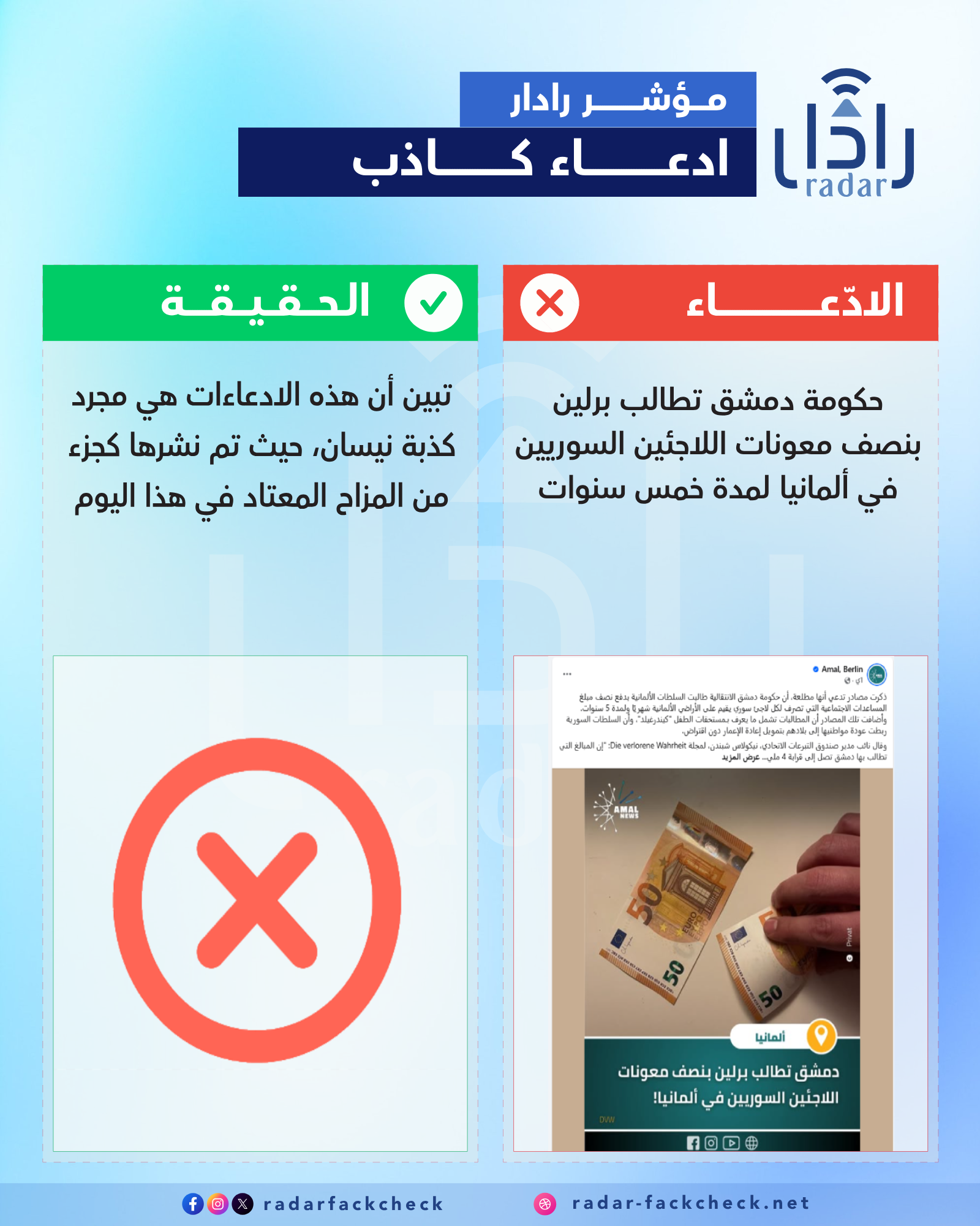 أجرى فريق منصة رادار بحثاً دقيقاً حول الادعاءات التي تم تداولها على مواقع التواصل الاجتماعي، والتي تشير إلى أن حكومة دمشق طالبت برلين بتحمل نصف معونات اللاجئين السوريين في ألمانيا لمدة خمس سنوات، وتبين أن هذه الادعاءات هي مجرد كذبة نيسان، حيث تم نشرها كجزء من المزاح المعتاد في اليوم الأول من نيسان من كل عام، وهو ما ذكرته الصفحات في نهاية المقال.