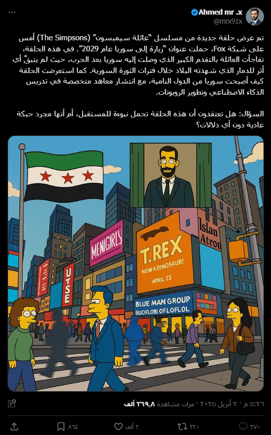 تم عرض حلقة جديدة من مسلسل “عائلة سيمبسون” (The Simpsons) أمس على شبكة Fox، حملت عنوان “زيارة إلى سوريا عام 2029”. في هذه الحلقة، تفاجأت العائلة بالتقدم الكبير الذي وصلت إليه سوريا بعد الحرب، حيث لم يتبقَّ أي أثر للدمار الذي شهدته البلاد خلال فترات الثورة السورية. كما استعرضت الحلقة كيف أصبحت سوريا من الدول النامية، مع انتشار معاهد متخصصة في تدريس الذكاء الاصطناعي وتطوير الروبوتات.