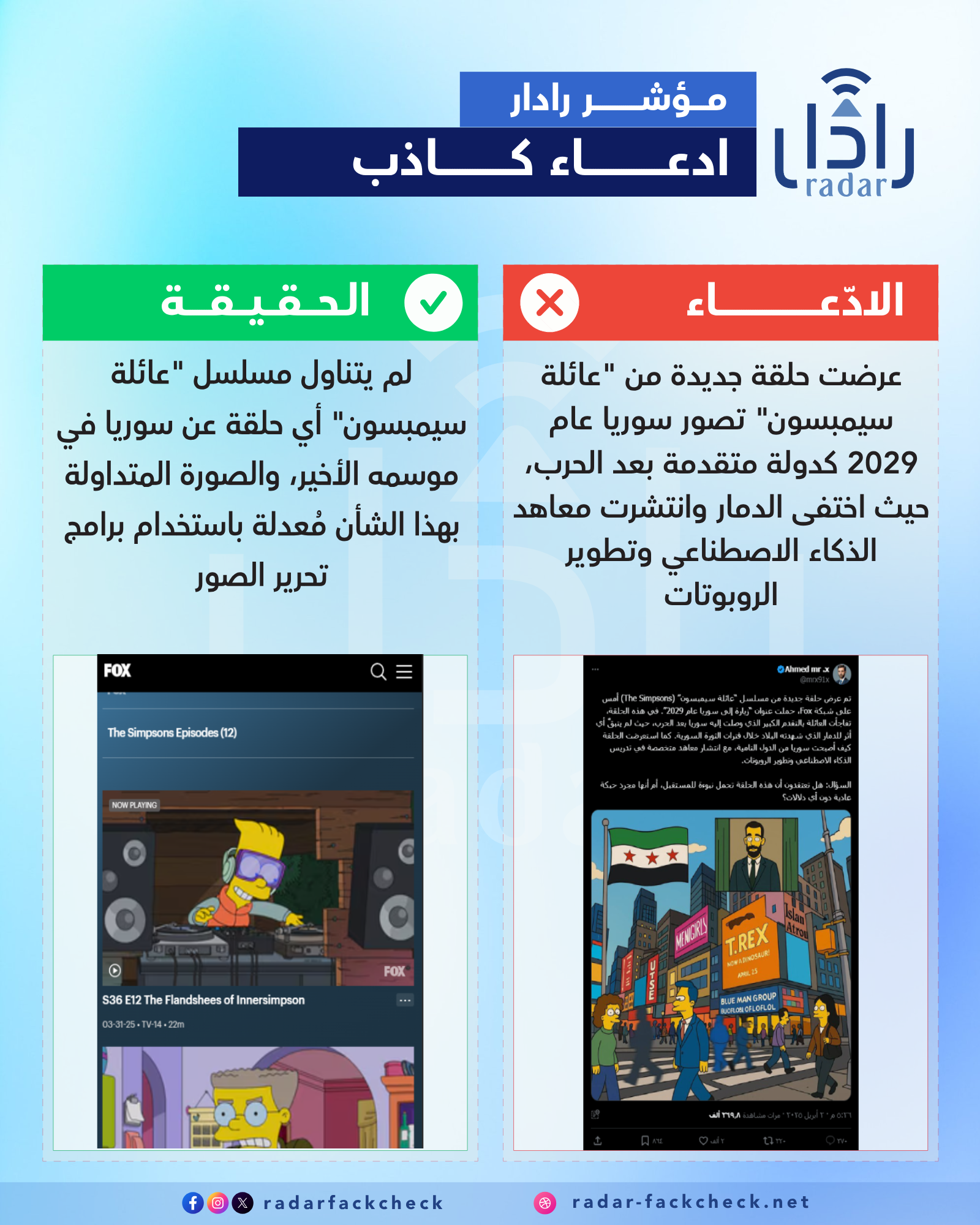 تداولت حسابات على منصات التواصل الاجتماعي صورة مزعومة من مسلسل “عائلة سيمبسون” قالوا إنها من حلقة عرضت عن سوريا عام 2029 بعنوان “زيارة إلى سوريا عام 2029”. في هذه الحلقة، تفاجأت العائلة بالتقدم الكبير الذي وصلت إليه سوريا بعد الحرب، حيث اختفى أي أثر للدمار الذي شهدته البلاد خلال فترات الثورة السورية. كما استعرضت الحلقة كيف أصبحت سوريا من الدول المتقدمة، مع انتشار معاهد متخصصة في تدريس الذكاء الاصطناعي وتطوير الروبوتات. ولكن بعد التحقق، تبين أن الصورة كانت معدلة باستخدام برامج تحرير الصور.
